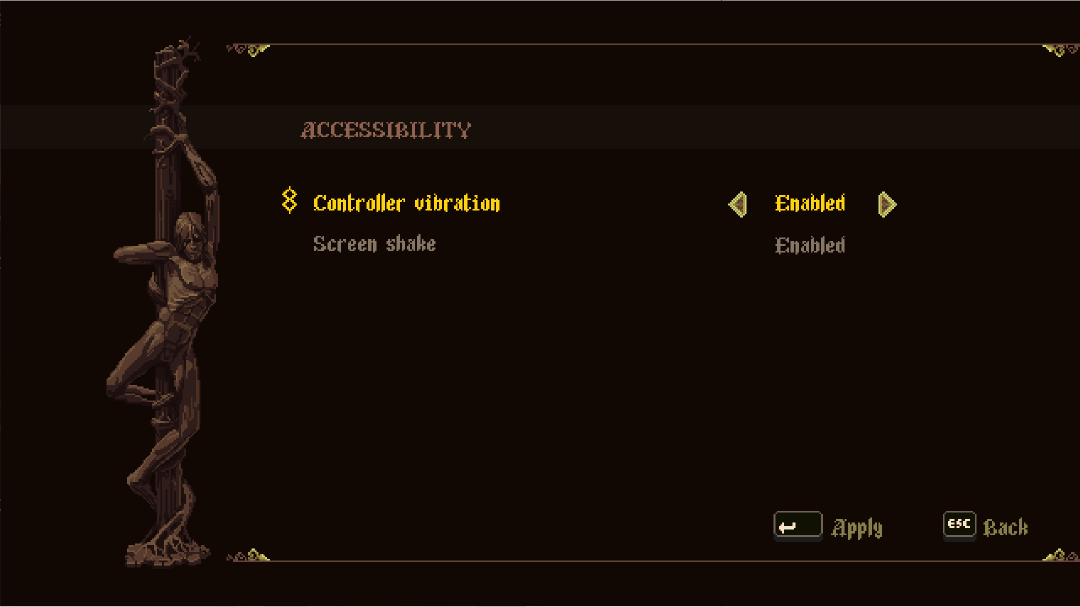 There are no colour blindness options and I feel that the contrast between some of the body text and backgrounds is a little low. To compound the readability issue, a custom gothic pixel font is being used for all text and can be hard to read in longer paragraphs. I do appreciate the world building and atmosphere that this font choice brings but would be wary in the testing phase of any complaints and maybe offer a more standard font swap in the options.