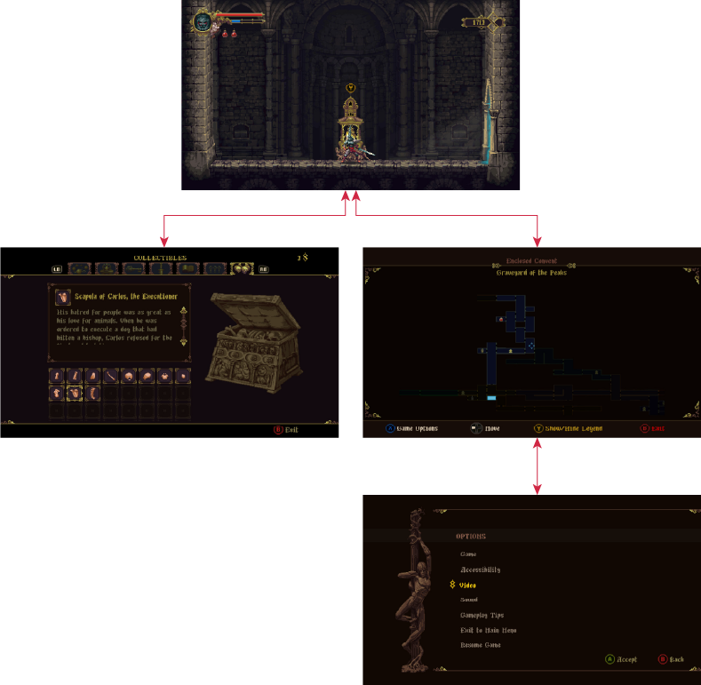Diving deeper into how the in-game menus relate to each other, I started to wonder if it wouldn’t be better to combine them into one main hub screen. This would also affect the options menu so I will expand on this in the following section.
