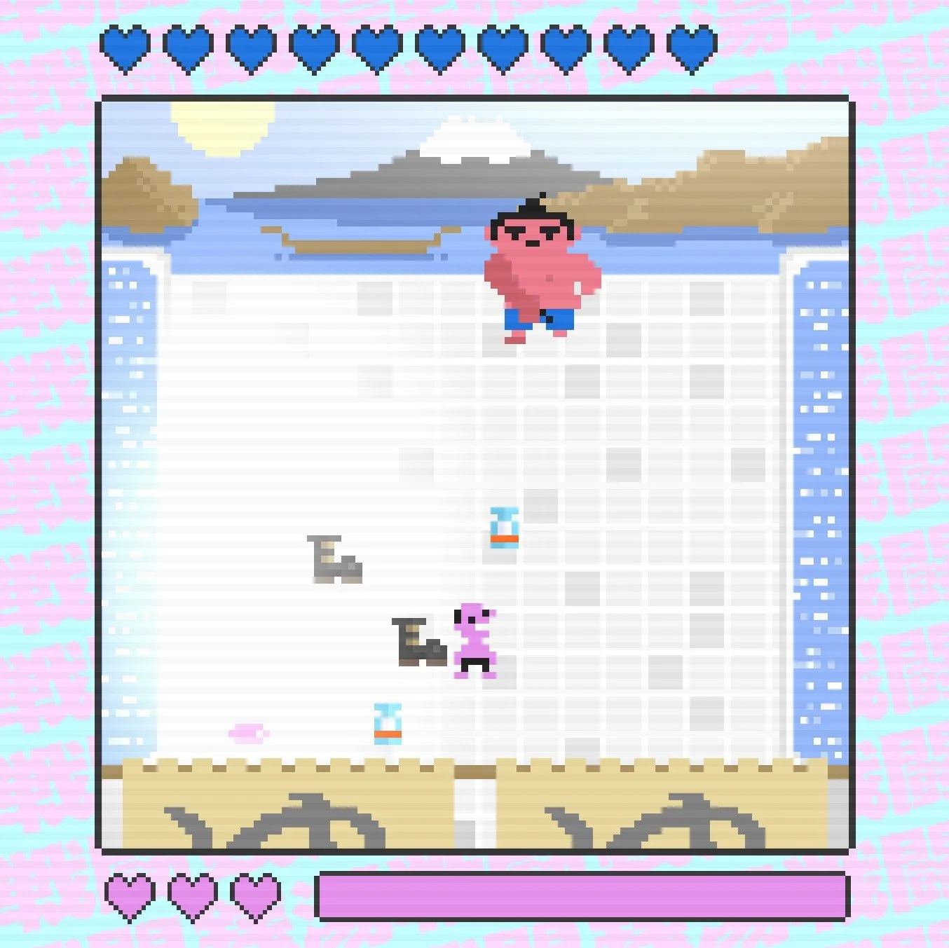Sento Sento is a simple, 2D, single screen, pixel style arcade game. Where the goal is to bounce the objects back at the boss, or avoid them when the spin attack is on cool-down.
